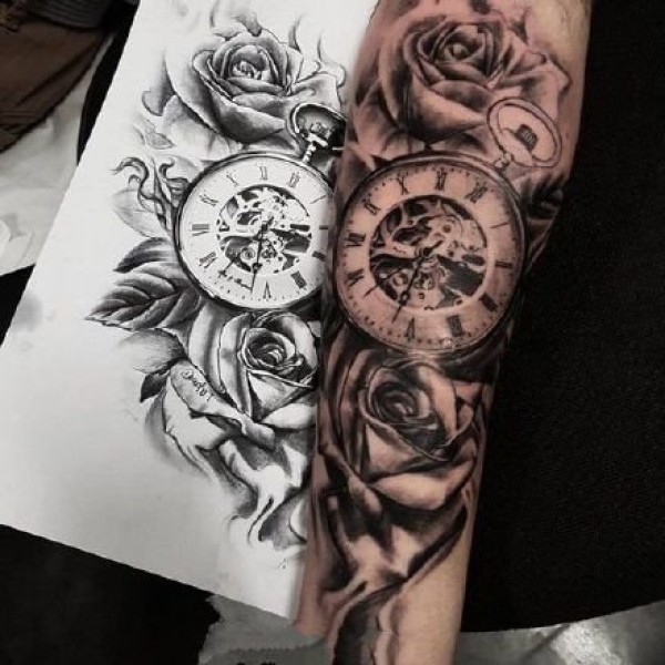 手臂胳膊上的欧美黑灰钟表玫瑰纹身图案9张