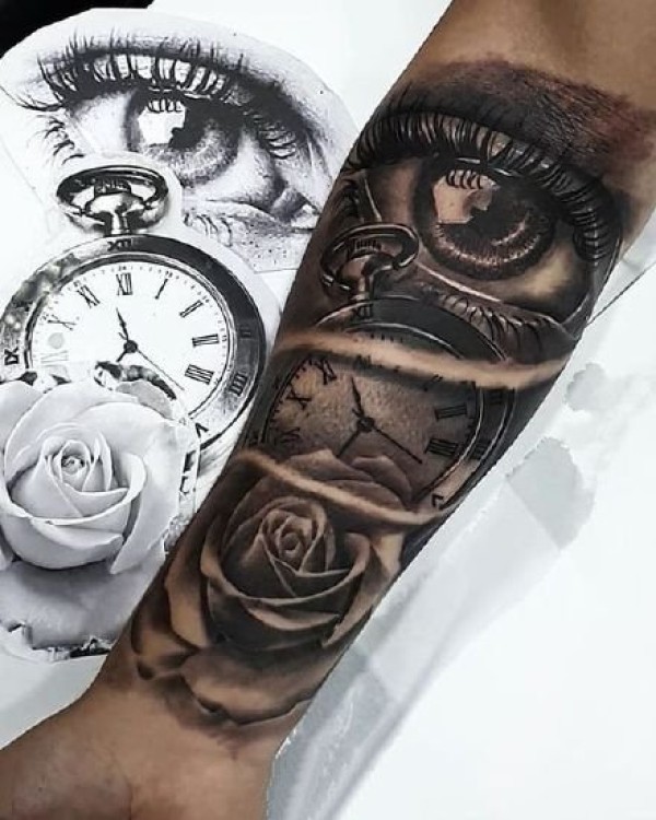 手臂胳膊上的欧美黑灰钟表玫瑰纹身图案9张