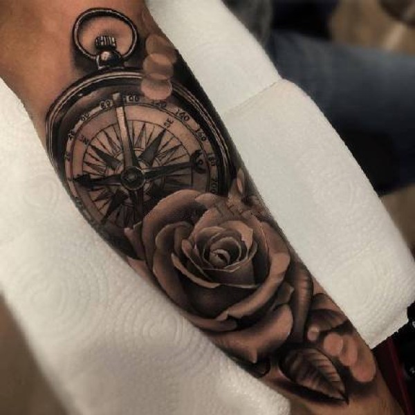 手臂胳膊上的欧美黑灰钟表玫瑰纹身图案9张