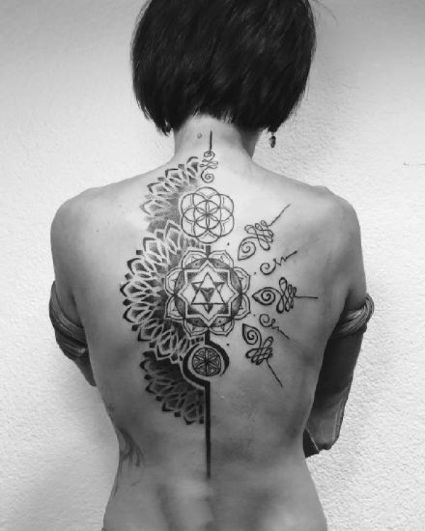 9张后背位置的背部点刺梵花纹身图案
