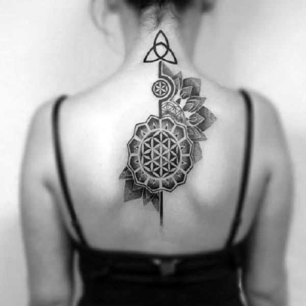 适合女生纹在后背脊柱处的唯美梵花纹身图案