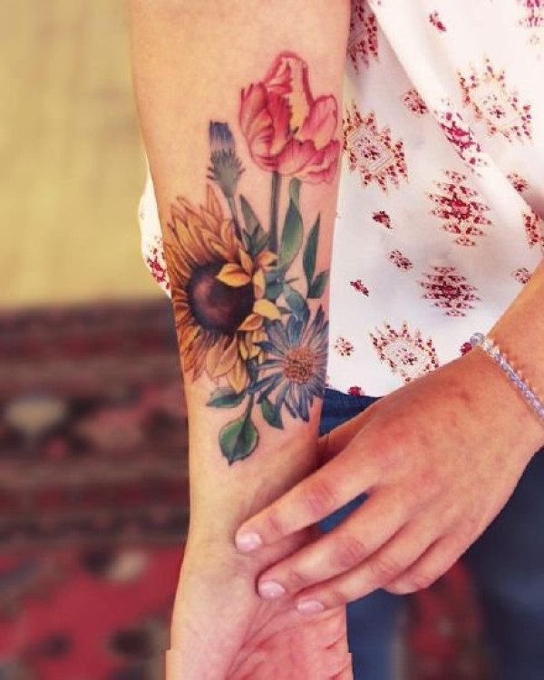 植物纹身 男生手臂上英文和向日葵纹身图片