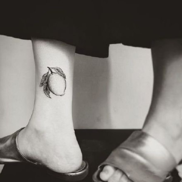 女生脚踝上黑灰点刺几何简单线条水果柠檬纹身图片
