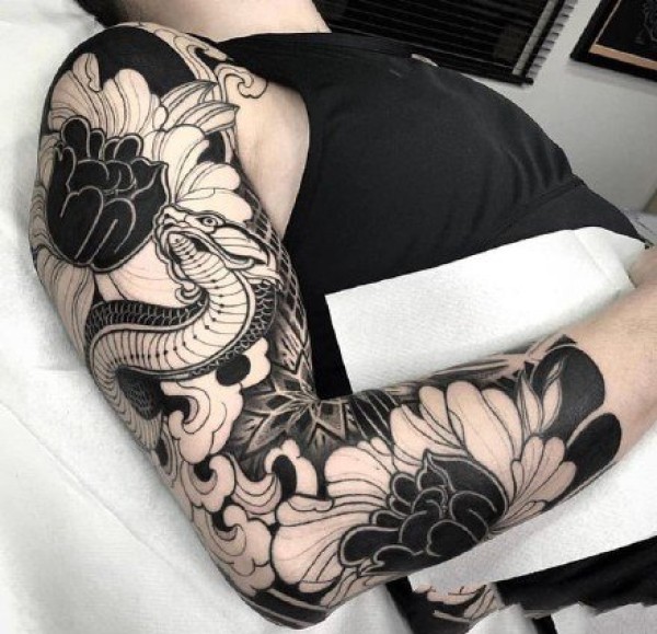 欧美花臂纹身_22张霸气黑灰欧美大黑花臂纹身图案作品图片