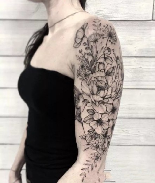 大臂素花纹身 9款女士的大臂黑灰花朵植物纹身图案