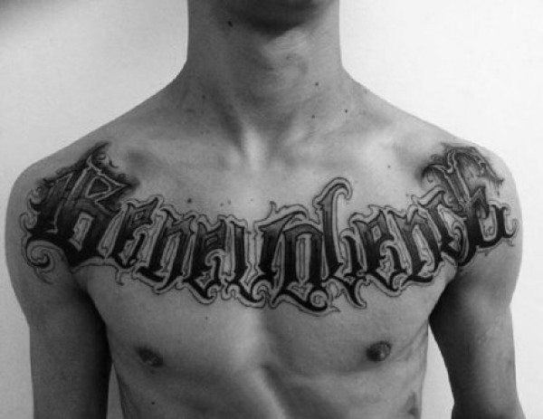 胸口花体字纹身 男性胸部的黑灰色花体字纹身图片
