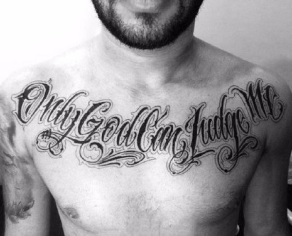 胸口花体字纹身 男性胸部的黑灰色花体字纹身图片