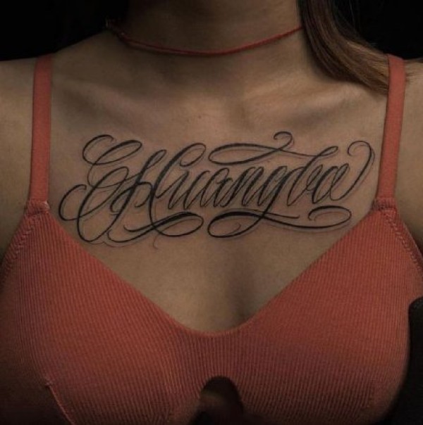 胸口花体字纹身 男性胸部的黑灰色花体字纹身图片