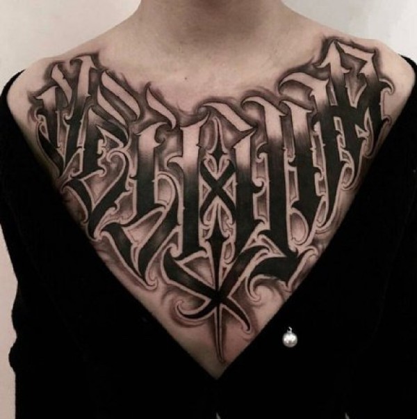胸口花体字纹身 男性胸部的黑灰色花体字纹身图片