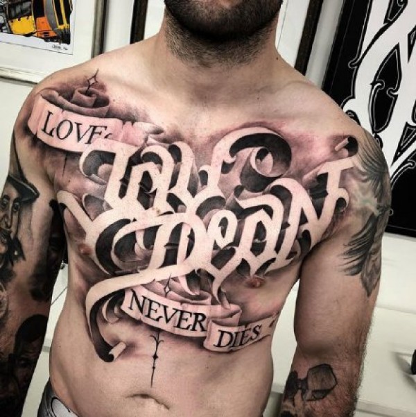 胸口花体字纹身 男性胸部的黑灰色花体字纹身图片