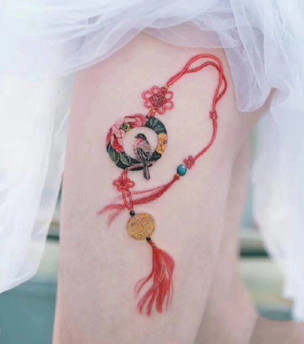 日式传统的扇子绳结等红色调小清新纹身图片