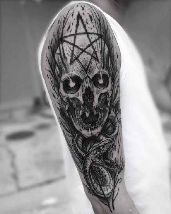 超帅时尚的黑灰骷髅与蛇纹身图案