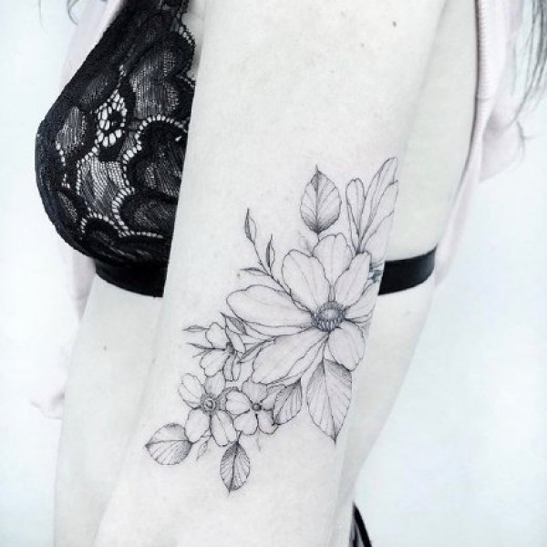 大臂素花纹身 9款女士的大臂黑灰花朵植物纹身图案