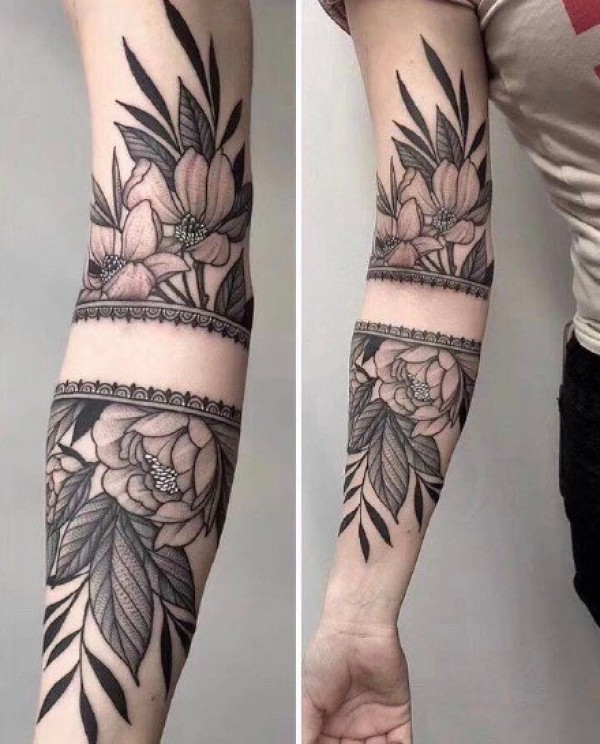 大臂素花纹身 9款女士的大臂黑灰花朵植物纹身图案