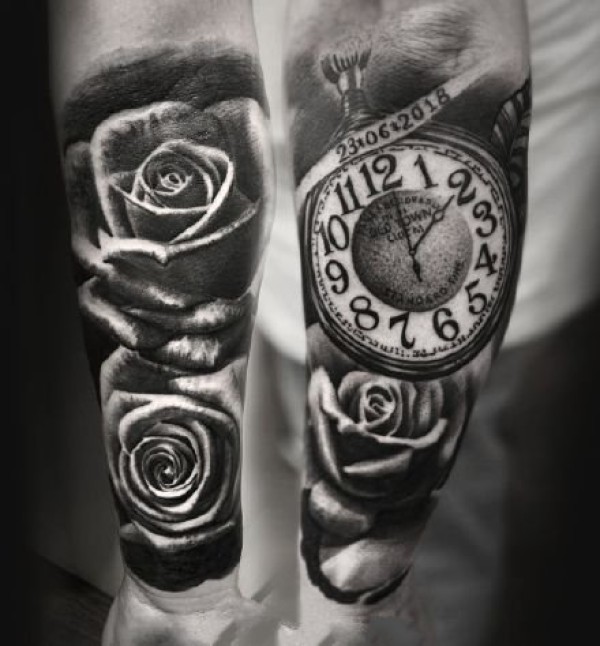 手臂胳膊上的欧美黑灰钟表玫瑰纹身图案9张