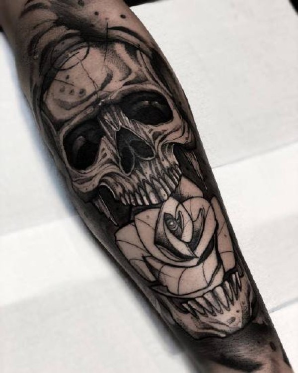 黑灰色玫瑰花和骷髅头纹身图片手稿