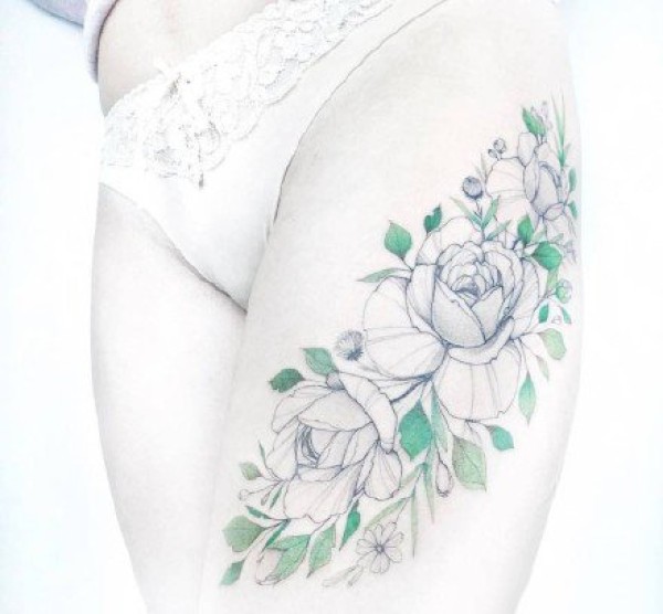 性感大腿纹身 女士大腿处性感的花花纹身图片