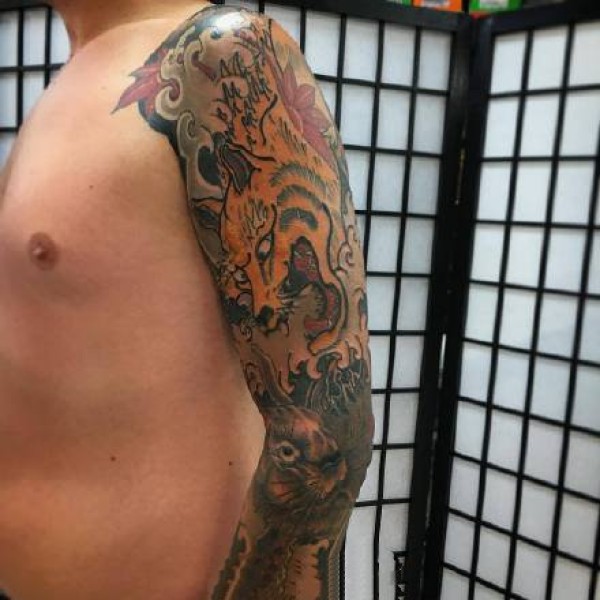 传统风格的一组男性花臂和花腿纹身图案欣赏