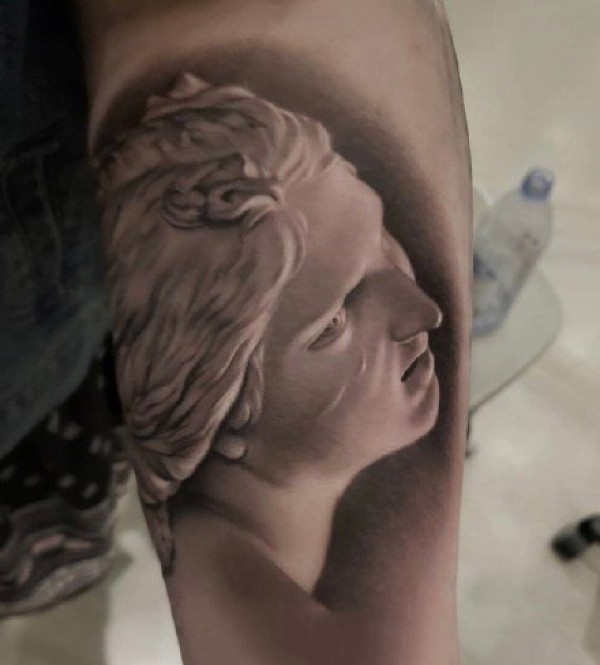 手臂上线条感很不错的黑灰欧美人像纹身图案