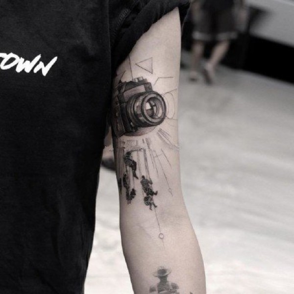 手指上纹身小图案 女生手臂上黑灰色的相机纹身图片