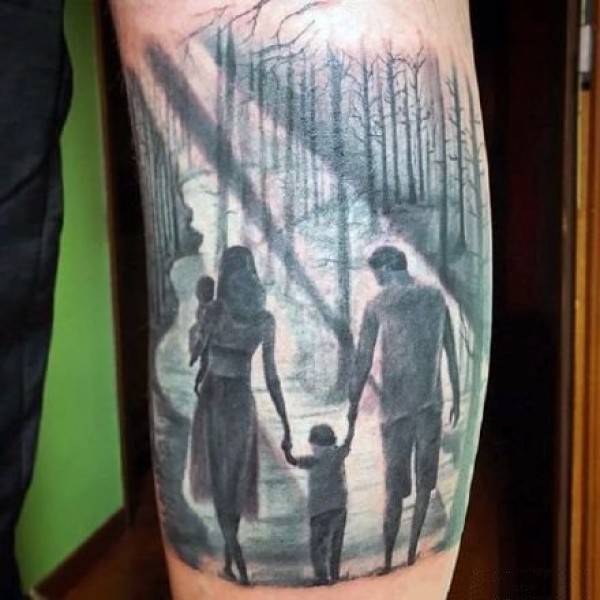 小腿华丽的黑色家庭人像和湖泊纹身图案