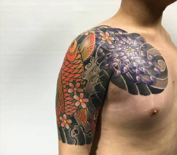 来自中国经典的传统半甲喜庆鲤鱼牡丹纹身手稿_半甲纹身图案大全_纹身图吧