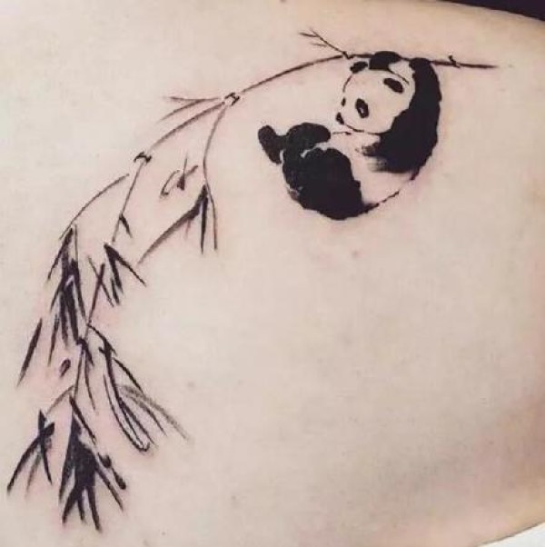 纹身水墨画 男生小腿上黑色的竹子和小鸟纹身图片