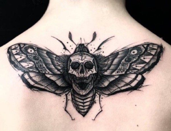 暗黑school风格的骷髅飞蛾纹身图片