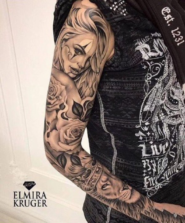 欧美花臂纹身_22张霸气黑灰欧美大黑花臂纹身图案作品图片