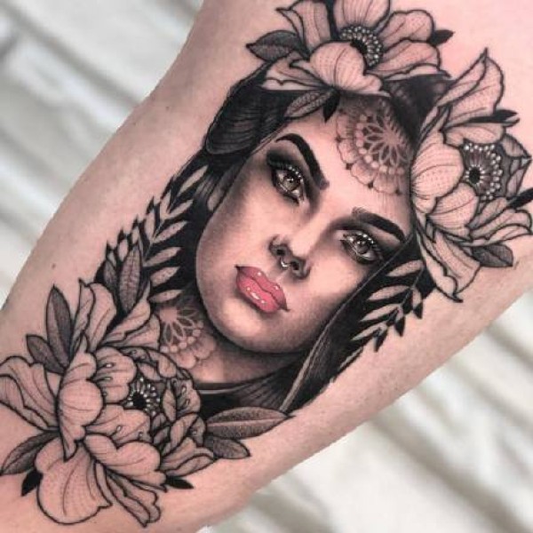 手臂女郎纹身:9款包臂的黑灰女郎纹身作品