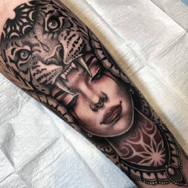 手臂女郎纹身:9款包臂的黑灰女郎纹身作品