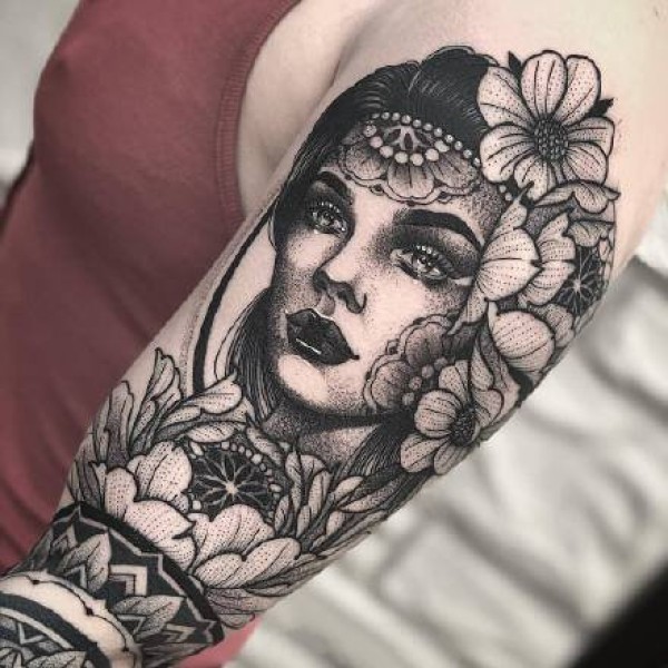手臂女郎纹身:9款包臂的黑灰女郎纹身作品