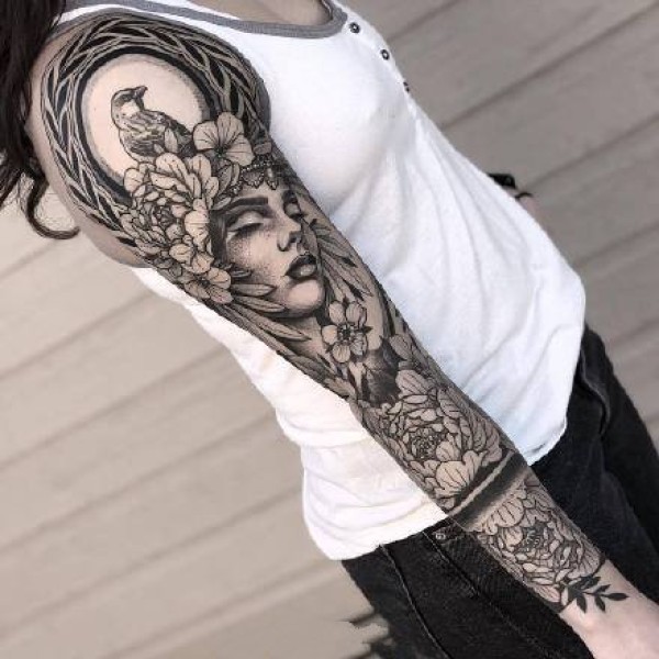 手臂女郎纹身:9款包臂的黑灰女郎纹身作品
