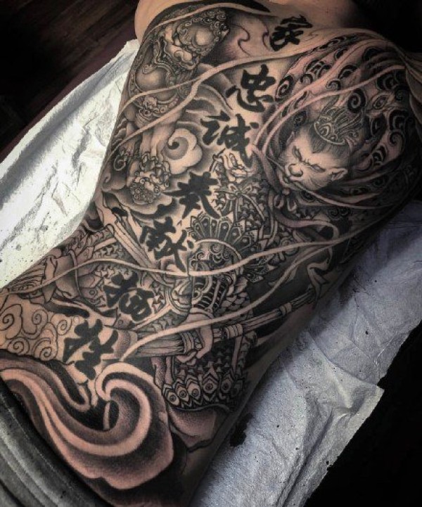 新传统风格的9张男性黑灰大满背纹身图案图片