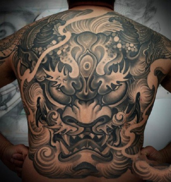 新传统风格的9张男性黑灰大满背纹身图案图片