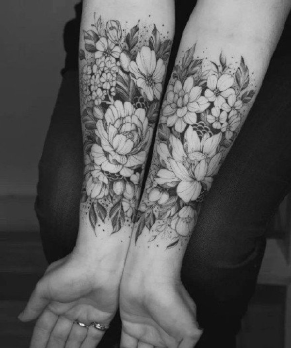 大臂素花纹身 9款女士的大臂黑灰花朵植物纹身图案