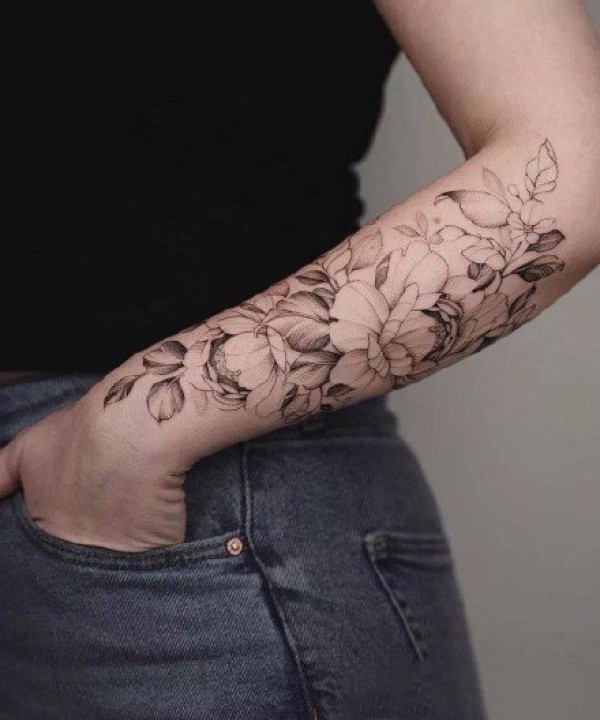 大臂素花纹身 9款女士的大臂黑灰花朵植物纹身图案