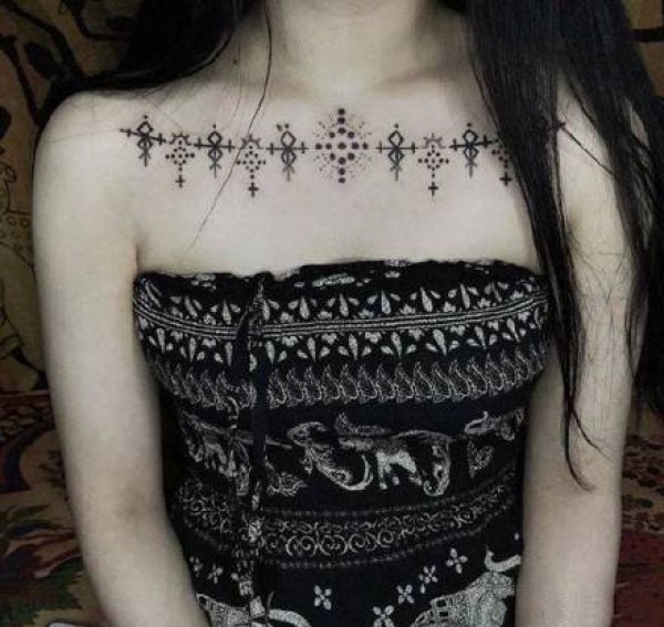 女生胸前锁骨处的一组黑灰漂亮纹身图片