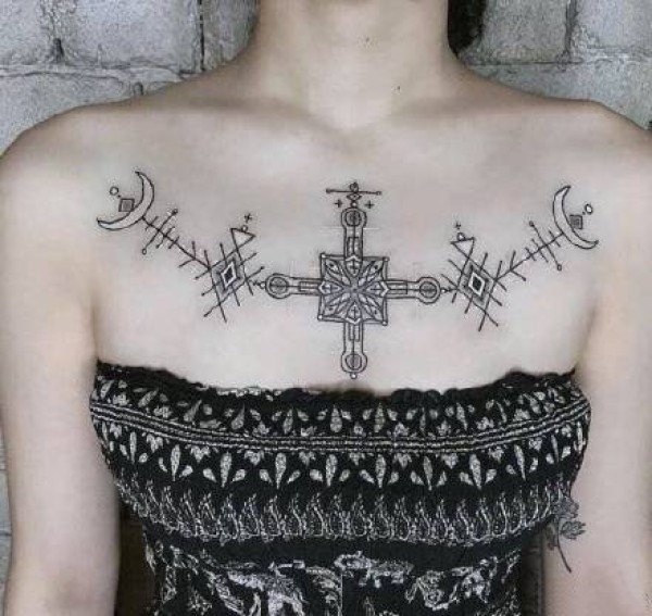 女生胸前锁骨处的一组黑灰漂亮纹身图片