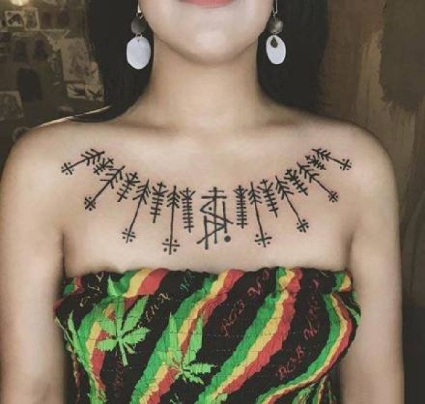 女生胸前锁骨处的一组黑灰漂亮纹身图片