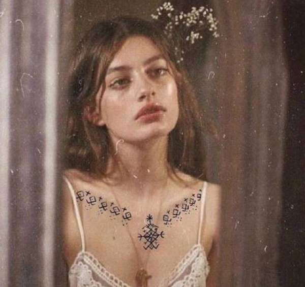女生胸前锁骨处的一组黑灰漂亮纹身图片