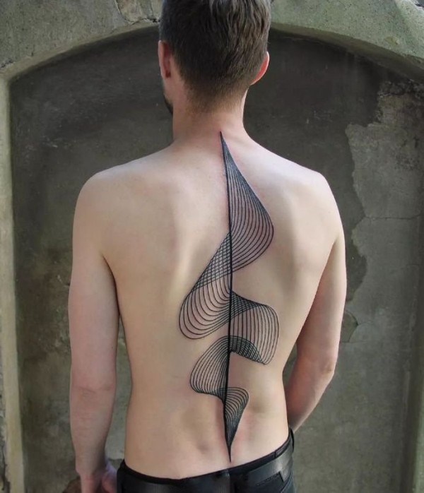 女生后腰纹身黑白灰风格抽象线条纹身图案