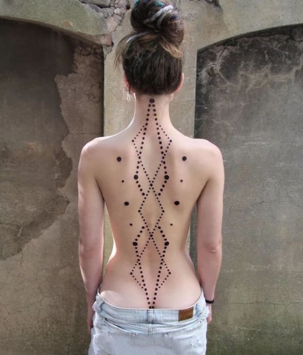 女生后腰纹身黑白灰风格抽象线条纹身图案