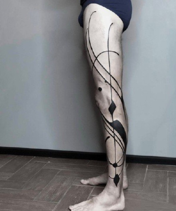 大腿上黑白灰风格点刺身抽象线条人物肖像纹身图片