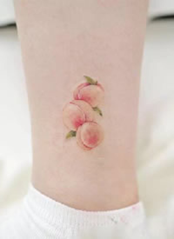 男生手臂上彩绘渐变简单线条植物叶子和桃子纹身图片