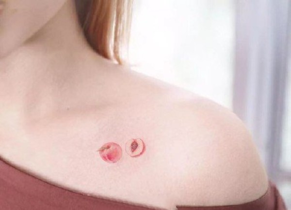 男生手臂上彩绘渐变简单线条植物叶子和桃子纹身图片