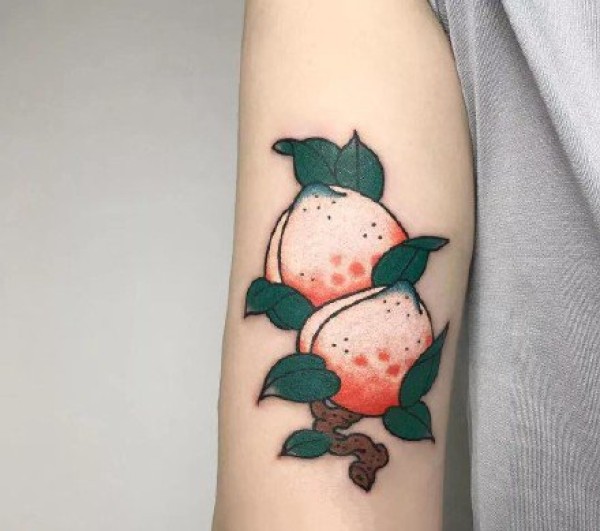 男生手臂上彩绘渐变简单线条植物叶子和桃子纹身图片
