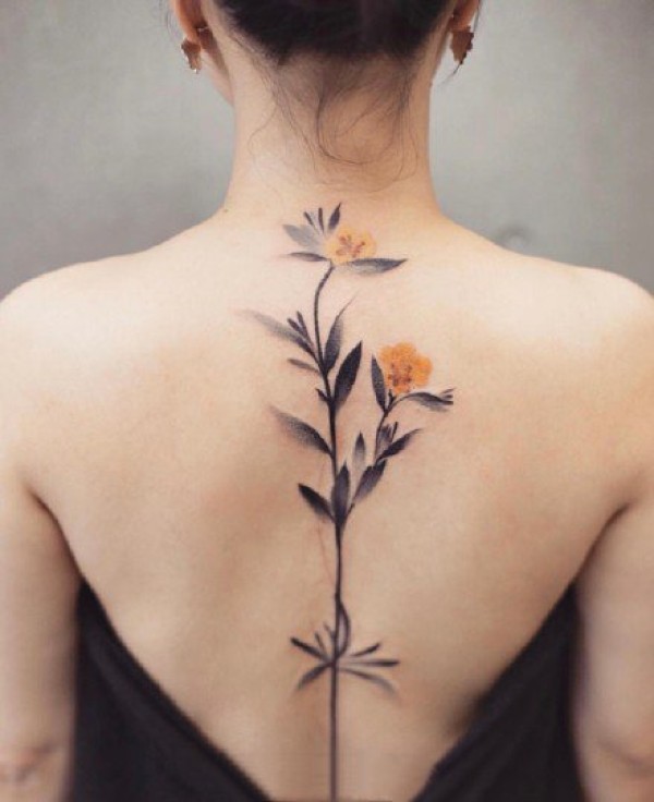 女生纹身美背 女孩子后背彩色水墨花朵等小纹身
