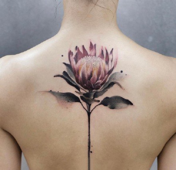 女生纹身美背 女孩子后背彩色水墨花朵等小纹身