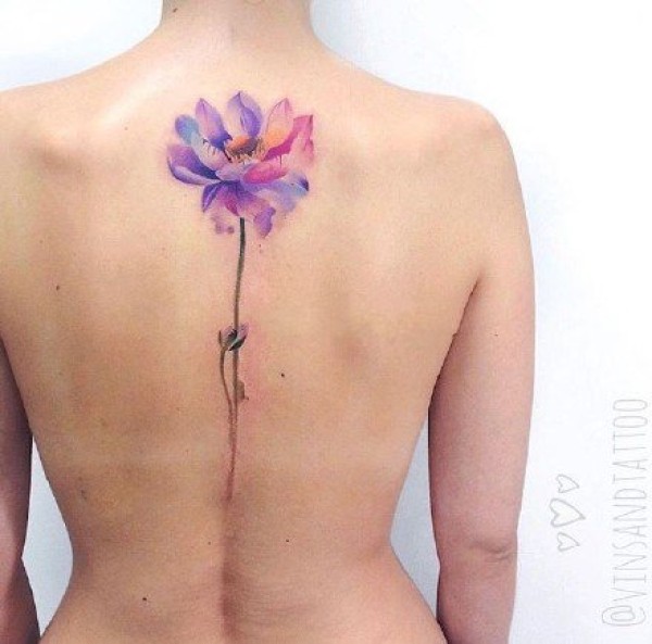 水彩荷花纹身 女生背部几款水彩色荷花纹身图案
